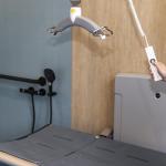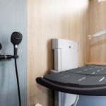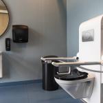 Toilet: Ja, højdejusterbart toilet med støttearm