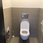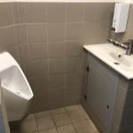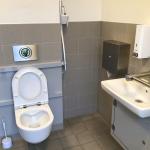 Handicap toilet med løftelift, liggeleje og brus (se foto af skiltet ang. dette), derudover er der en bygning med dame toilet i den ene ende og herre toilet i den anden ende.