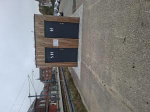 Placering: Ved parkeringspladsen overfor jernbaneskinnerne. Der er både handicap og unisex Adgang: Adgang med sms eller opkald (se billede) Åbningstider: Hele døgnet